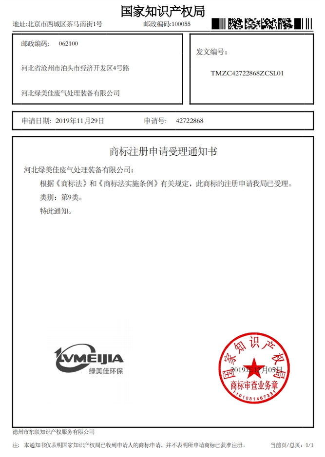 绿美佳商标注册申请受理通知书